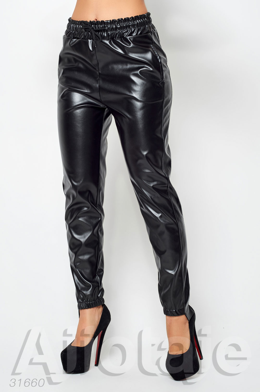 Кожаные брюки черного цвета с талией на кулиске