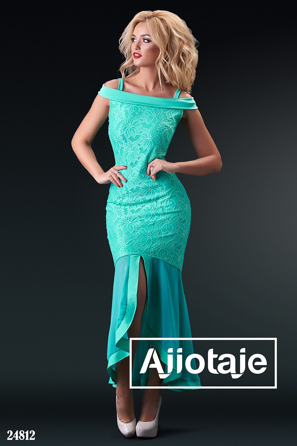 Платье мятного цвета с открытыми плечиками