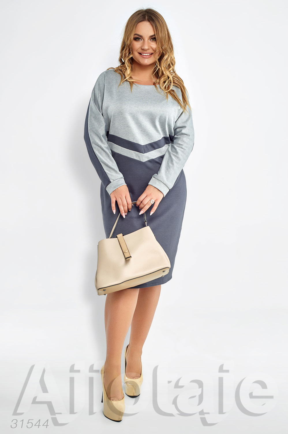 Серое трикотажное платье с длинным рукавом