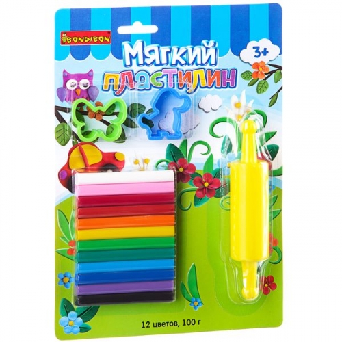 Мягкий пластилин с формочками и скалкой, Bondibon, 12 стандарт цв., 100 гр., CRD, арт. ST-100-12+2SM