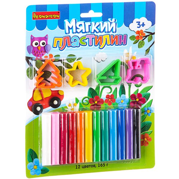 Мягкий пластилин с форм., 4 шт, Bondibon, 12 стандарт цв., 165 гр., CRD, арт. ST-165-12+4SM
