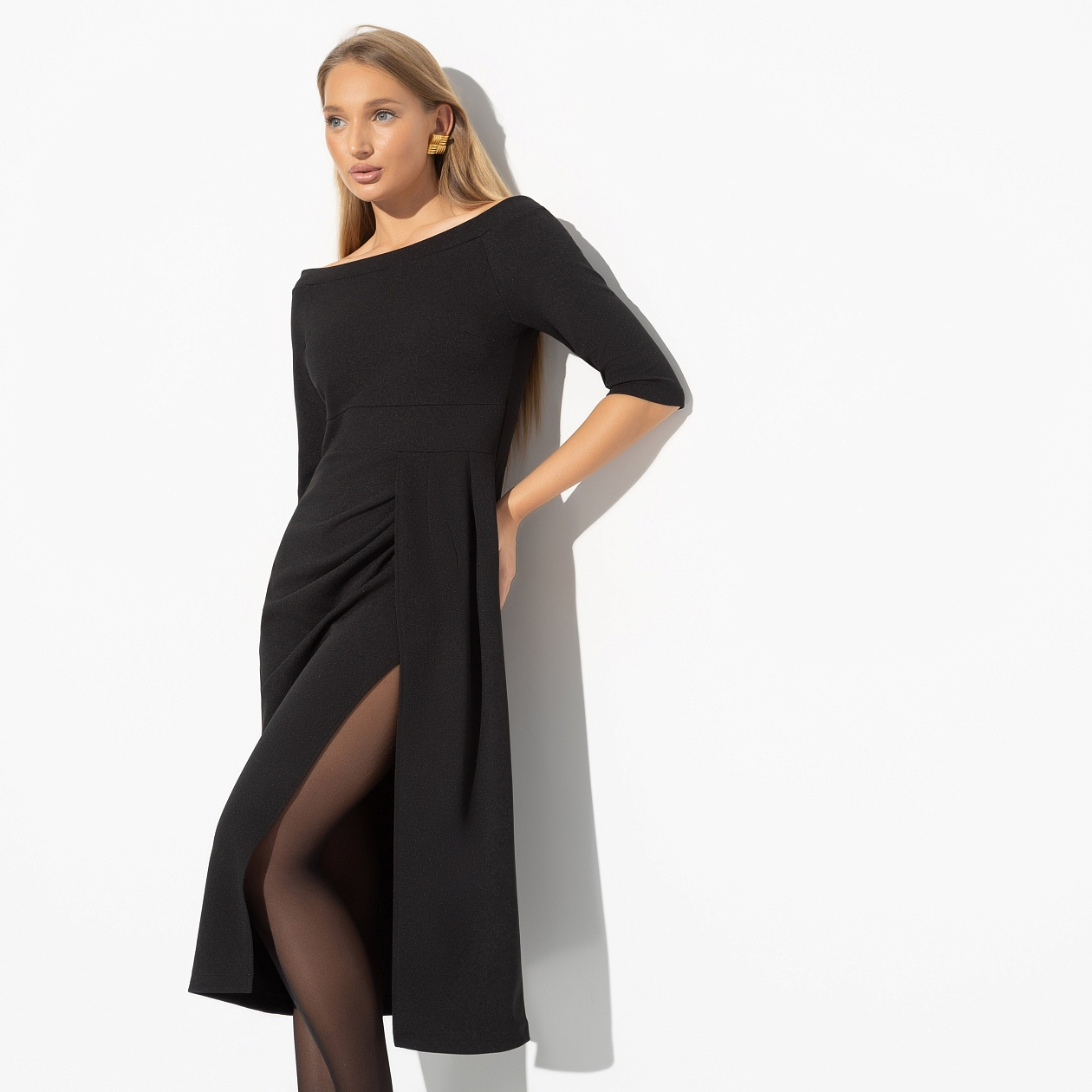 Платье с открытыми плечами и высоким разрезом, Деловой завтрак
