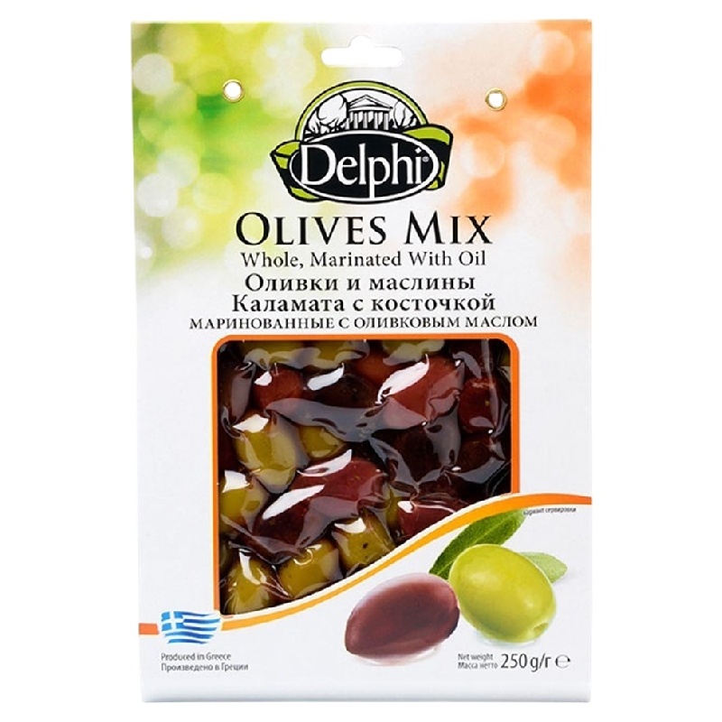 Оливки и маслины DELPHI с косточкой маринованные с оливковым маслом /вакуум/ 250г*8