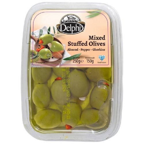 Ассорти DELPHI оливок, фаршированных миндалем, пастой из перца, корнишонами в рассоле /лоток/ 250г*6