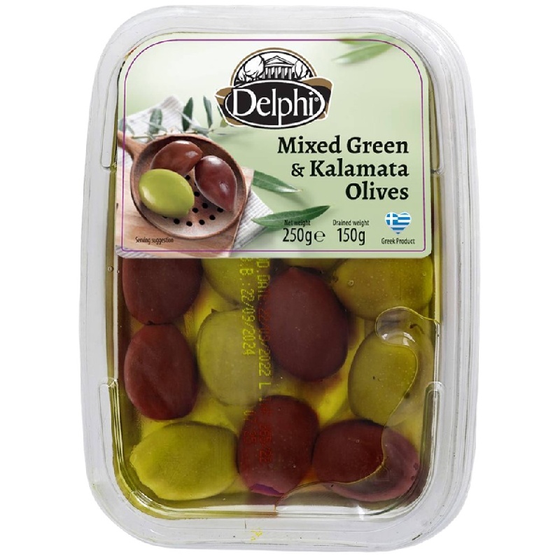 Оливки DELPHI микс зелёные и каламата с косточкой в рассоле /лоток/ 250г*6