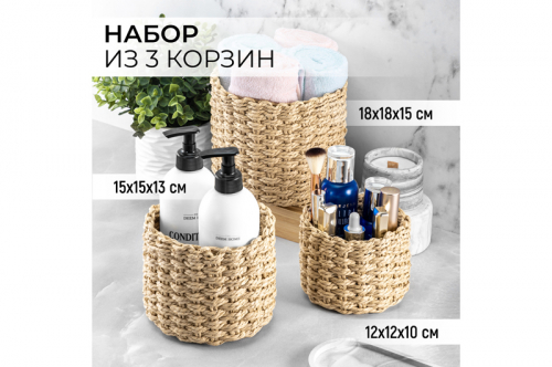 Набор 3 плетеных корзин 18*18*15см, 15*15*13см, 12*12*10см, соломеный