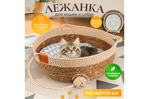 Лежанка плетеная для кошек и собак 40*40*14 см, с подушкой и игрушкой