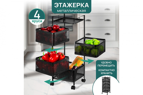Этажерка 4-х ярусная 27*27*80 см "Черная" с выдвижными корзинами, на колесиках, металлическая