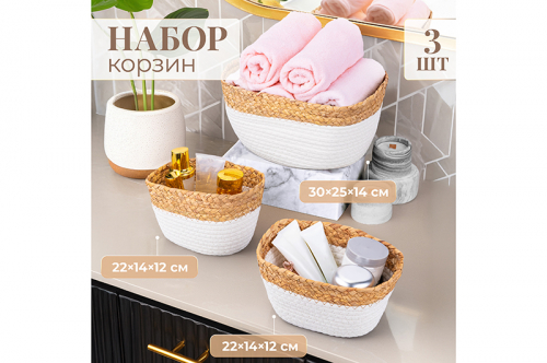 Набор 3 плетеных корзин 1 корзинка 30*25*14 см, 2 корзинки 22*14*12 см, белый