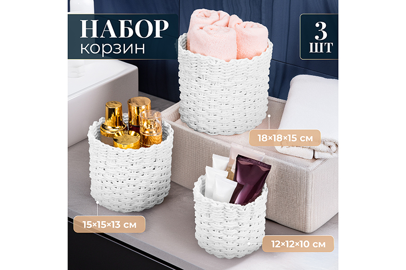 Набор 3 плетеных корзин, 1 корзинка 18*18*15 см, 1 корзинка 15*15*13см, 1 корзинка 12*12*10см, белый