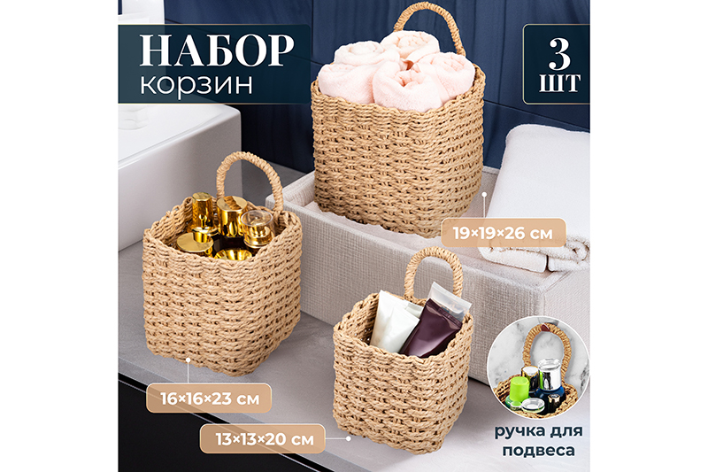 Набор 3 плетеных корзин, 1 корзинка 18*18*15 см, 1 корзинка 15*15*13см, 1 корзинка 12*12*10см, тем-с