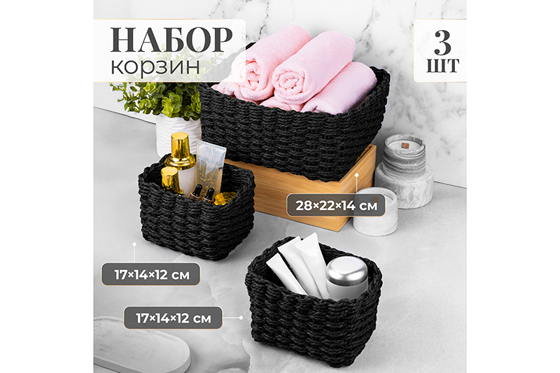 Набор 3 плетеных корзин, 1 корзинка 28*22*14,5 см, 2 корзинки 17*14*12 см, темно-серый