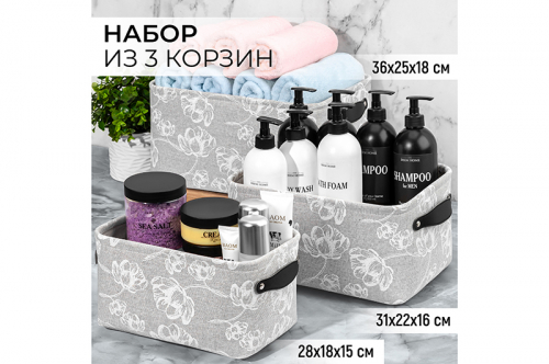 Набор 3 тканевых корзинок 36*25,5*18 см, с ручками, серый
