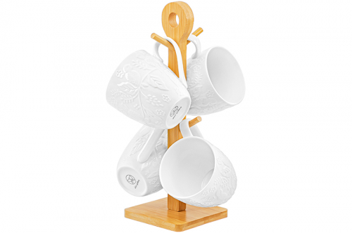 Набор 4 кружек 350 мл "Птички на ветке" на дерев. подставке