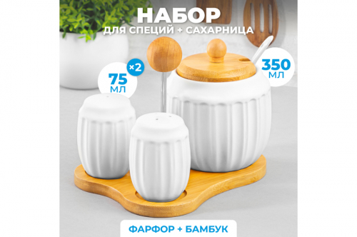 БЫЛО 748 руб! Набор - сахарница 350 мл "Ампир" с ложкой + солонка + перечница на дер. подст. с ручкой