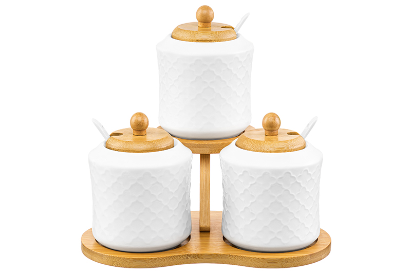 БЫЛО 974 руб! Набор 3 банок д/хранения 250 мл 9,3*9,3*7 см "Орнамент" +дер.крыш-подст. с сил/упл (бел,сер,охра)
