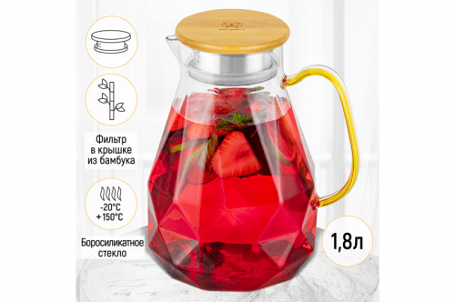 БЫЛО 1169 руб! Кувшин 1,8 л 18*14,5*21 см "Crystal glass" + дер. крышка с метал. фильтром и силик. проклад