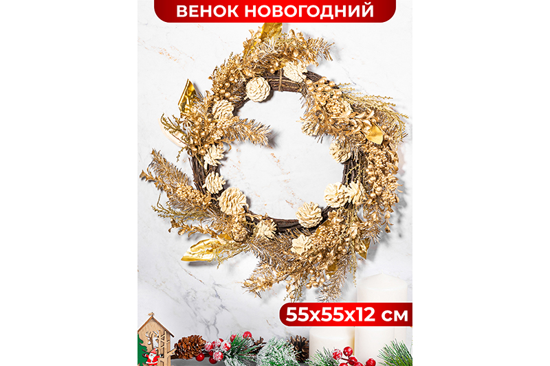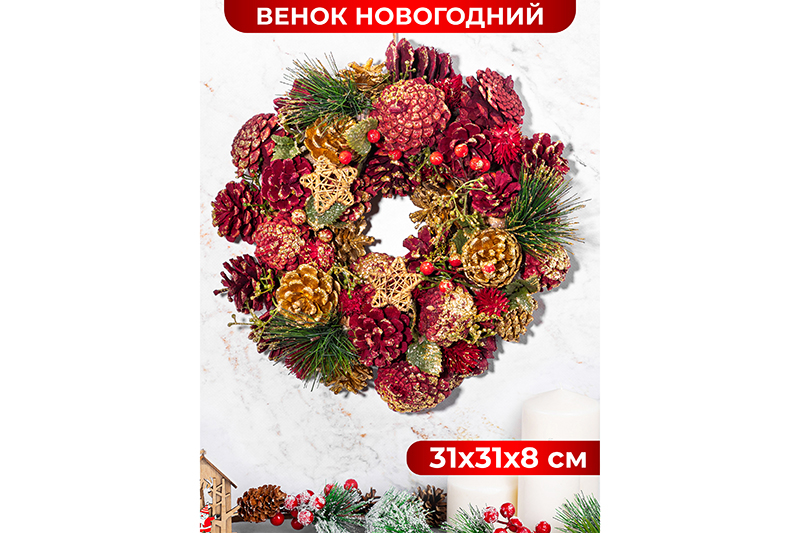 Новогоднее украшение венок 34*34*8 см "Заснеженные шишки" круг
