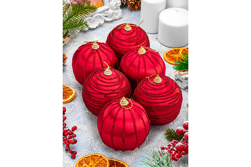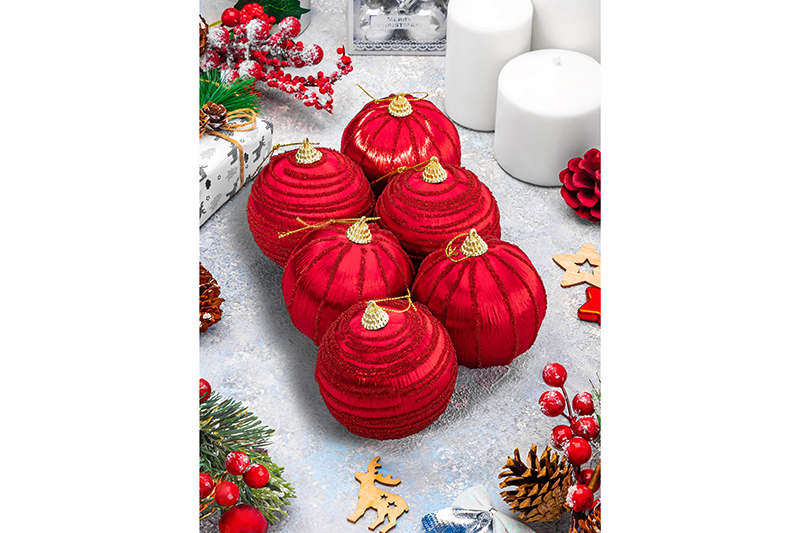 Набор 6 новогодних шаров 8*8 см "Полоски" красный, матовый