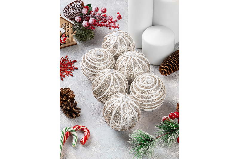 Набор 6 новогодних шаров 8*8 см "Полоски" шампань