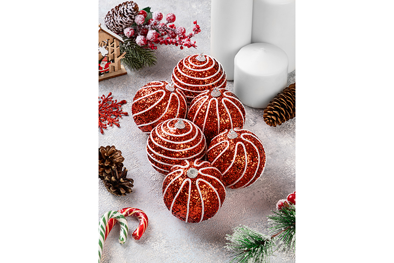 Набор 6 новогодних шаров 8*8 см "Полоски" красный