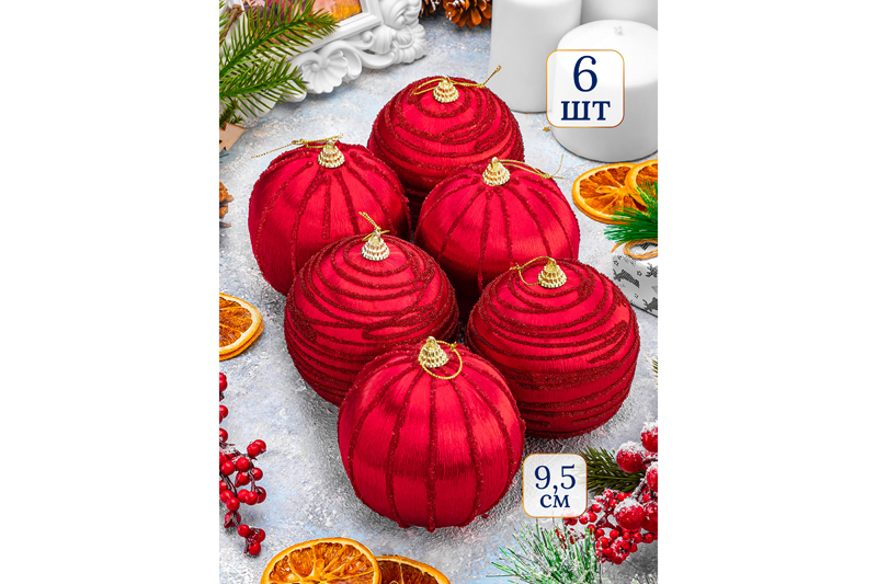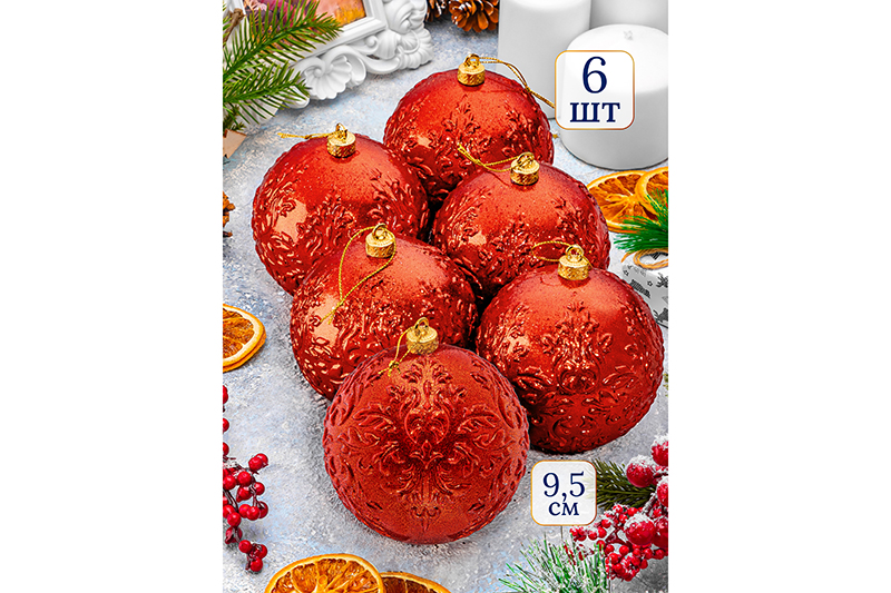 Набор 6 новогодних шаров 9,5*9,5 см "Красный"