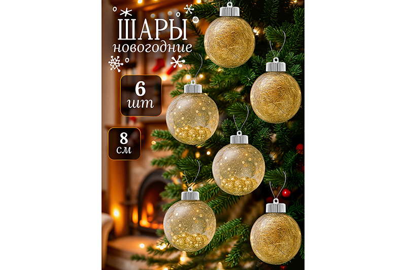 Набор 6 новогодних шаров 8*8 см "Шампань" прозрачные с наполнением