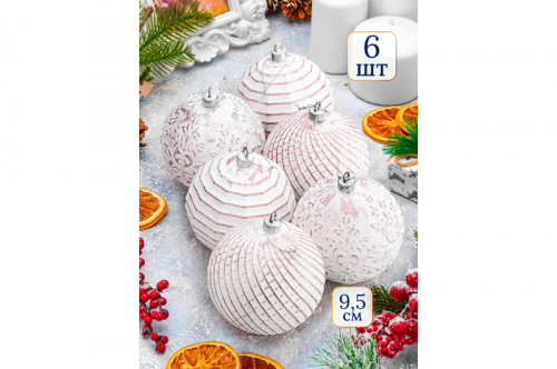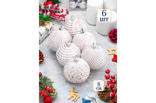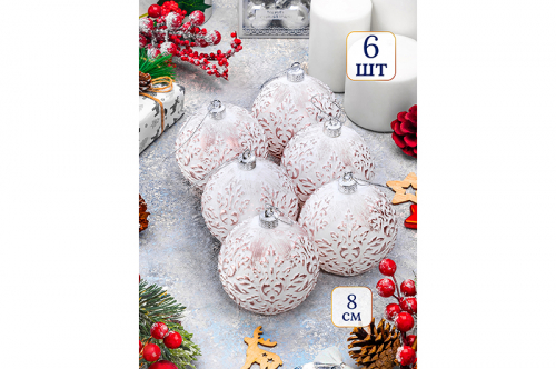 Набор 6 новогодних шаров 8*8 см "Белый с розовым" с эффектом старины