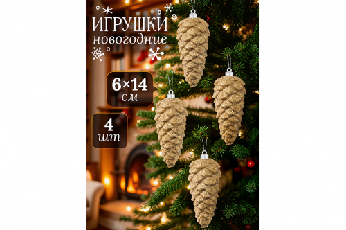 Набор 4 новогодних игрушек на елку 6*14 см "Шишки", шампань