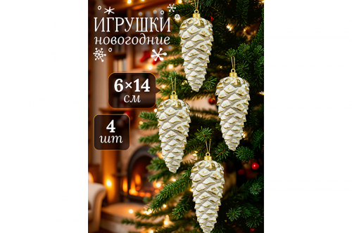 Набор 4 новогодних игрушек на елку 6*14 см "Шишки", бело-золотой
