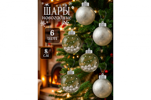 Набор 6 новогодних шаров 8*8 см "Серебро" прозрачные с наполнением