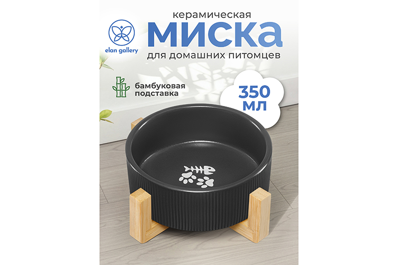 Миска для домашних питомцев 300 мл 12,5*12,5*6 см, с бамбуковой подставкой, темно-серая
