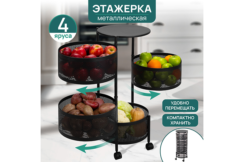 Этажерка 4-х ярусная 33,5*32*75,5 см "Черная" на колесиках, металлическая