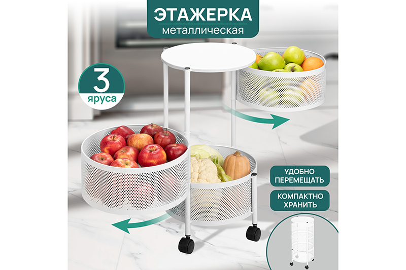 Этажерка 3-х ярусная 33,5*32*60,5 см "Белая" на колесиках, металлическая