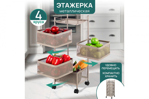 Этажерка 4-х ярусная 27*27*80 см, "Серо-коричневая", с выдвижными корзинами, на колесиках, метал.