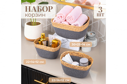 Набор 3 плетеных корзин 1 корзинка 30*25*14 см, 2 корзинки 22*14*12 см, серый