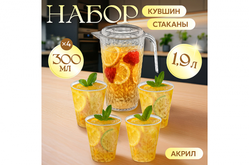 Набор 5 пр. - Кувшин с крышкой 1,9 л 19*13*25 см + стакан 300 мл 8*8*9,5 см (4 шт), акрил
