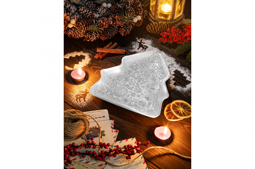 БЫЛО 763 руб! Блюдо 24*19*2,5 см "Елочка" белое с серебристым орнаментом