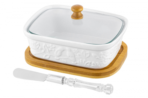 БЫЛО 753 руб! Паштетница 14,5*11*9 см 330 мл "Птички на ветке" со стекл. крышкой на дер. подставке + нож!!!