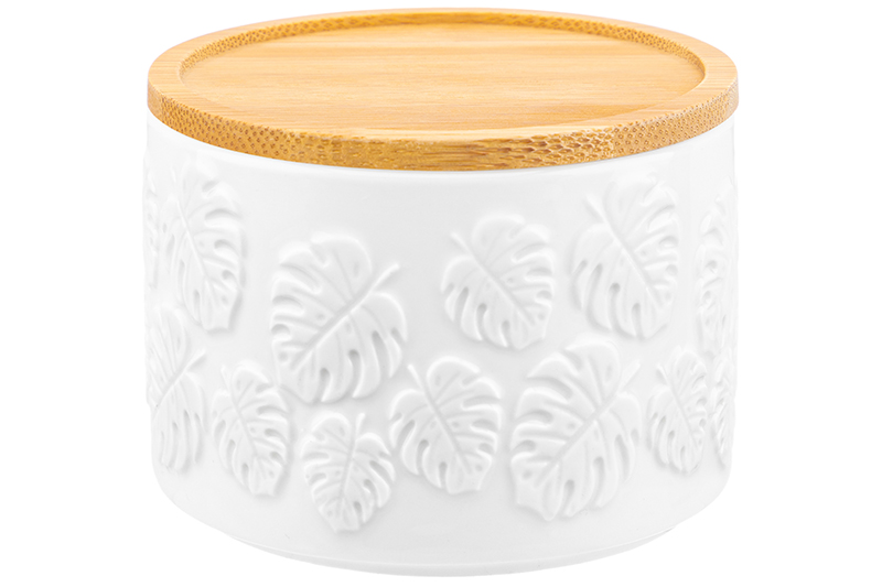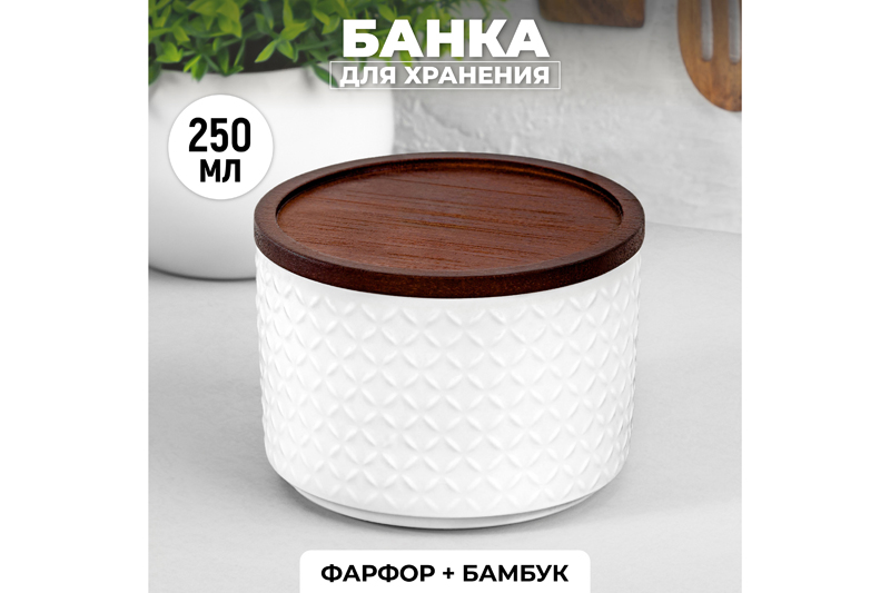 БЫЛО 280 руб! Банка д/хранения 250 мл 9,3*9,3*7 см "Орнамент" + дер. крыш.-подстав. с сил. упл., белая
