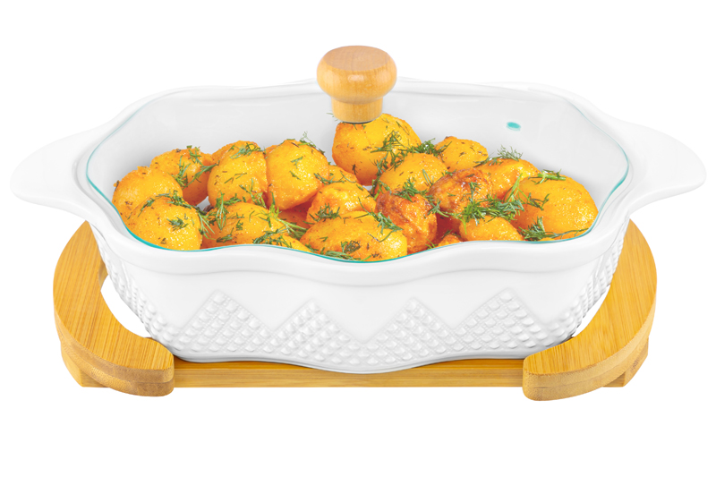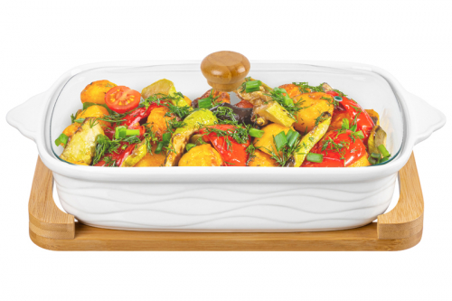 БЫЛО 2567 руб! Блюдо д/зап и серв 37*21*12 см 1,9 л "Айсберг волны" прямоуг. + стекл. крышка на дер. подставке