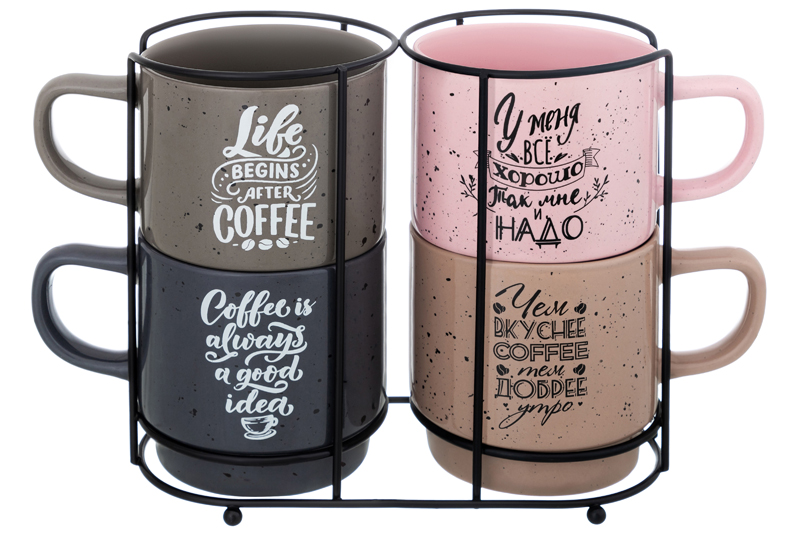 *БЫЛО 1341 руб! Набор 4 кружек 380 мл 13,5*9*9 см "Кофе" на металлической подставке NEW BONE CHINA