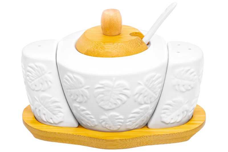 БЫЛО 874 руб! Набор - сахарница 300 мл 16*10*11 см "Тропики" с ложкой + солонка + перечница на дер. подст.
