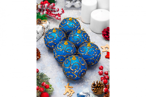 БЫЛО 722 руб! Набор 6 новогодних шаров 8*8 см "Вензеля" синий