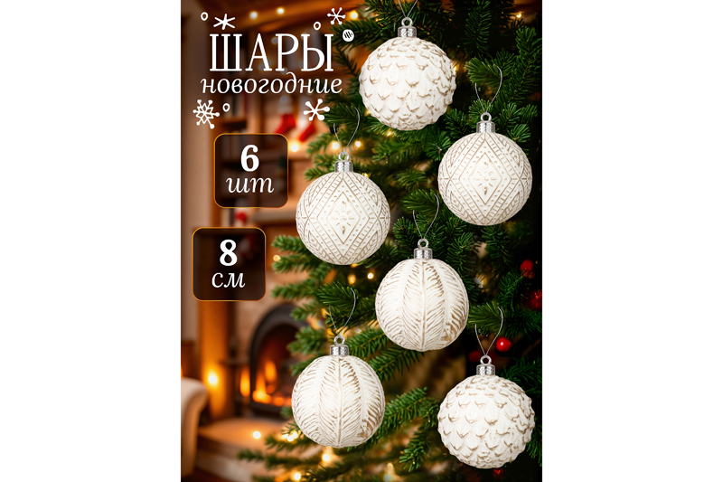 Набор 6 новогодних шаров 8*8 см "Винтаж" шампань с эффектом старины