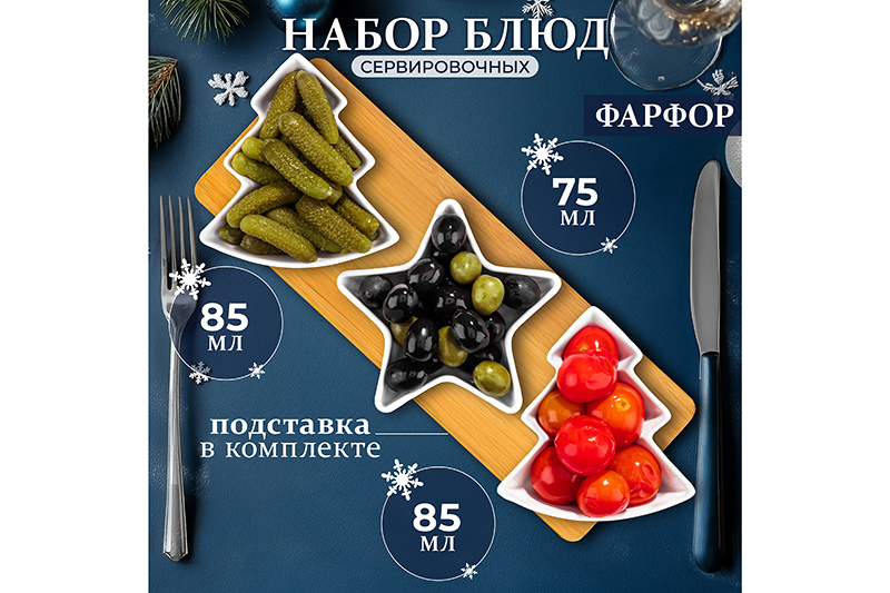 БЫЛО 1005 руб! Набор 3 сервировочных блюд 30*11*3,5 см "Елочки" на деревянной подставке