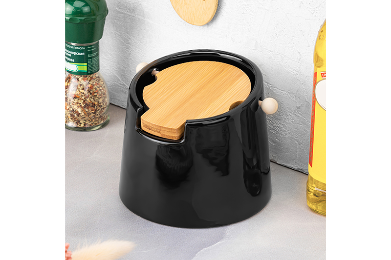БЫЛО 832 руб! Банка для сыпучих продуктов 700 мл 14,5*13,5*11,5 см "Черная" + откидная бамбук.крышка, керамика