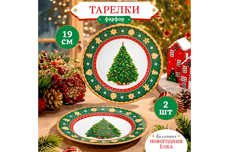 Набор тарелок для десертов 2 пр. 19*19*2 см "Новогодняя елка" зеленый узор NEW BONE CHINA