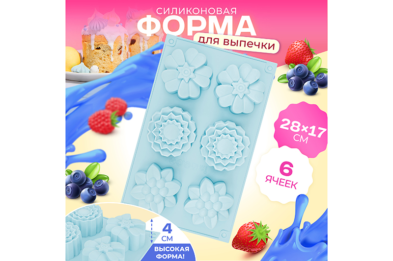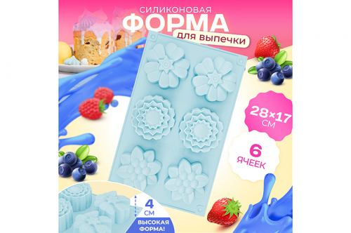 БЫЛО 315 руб! Форма для выпечки 6 ячеек 28,5*17,5*4 см "Цветы" голубая