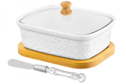 БЫЛО 824 руб! Паштетница 14,5*11*9 см 330 мл "Розы" со стекл. крышкой на дер. подставке + нож!!!